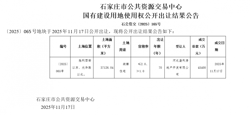 凤凰网房产获悉,〔2025〕065号地块于2025年11月17日公开出让,地块由河北盈利房地产开发有限公司以45400万元成功竞得。〔2025〕065号地块,位于胜利西街以东、光华路以北
