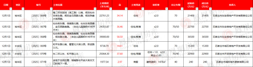 凤凰网房产土拍快讯,石家庄公共资源交易中心12月1日组织〔2025〕066-071号地块公开出让,最终6宗地块成功出让,其中城发投拿下信工学校三宗地块及石煤机地块,交投旗下公司拿下东二环外住宅商服用地