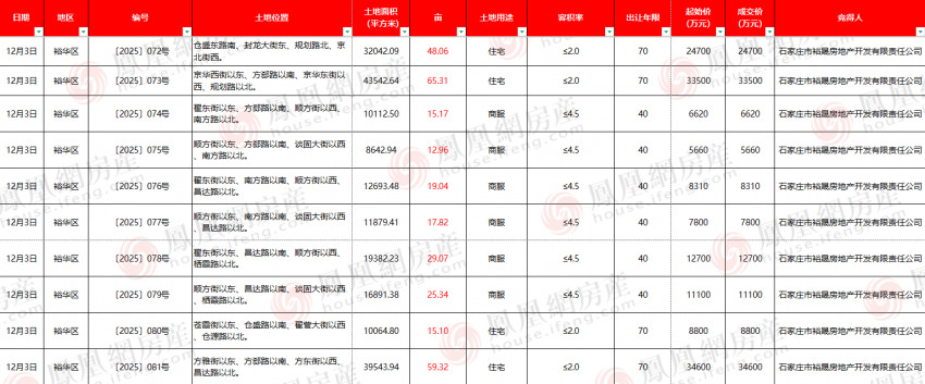 凤凰网房产土拍快讯,12月3日,石家庄市公共资源交易中心公开出让〔2025〕072-081号地块国有建设用地使用权,最终10宗地块均由石家庄市裕晟房地产开发有限责任公司底价竞得