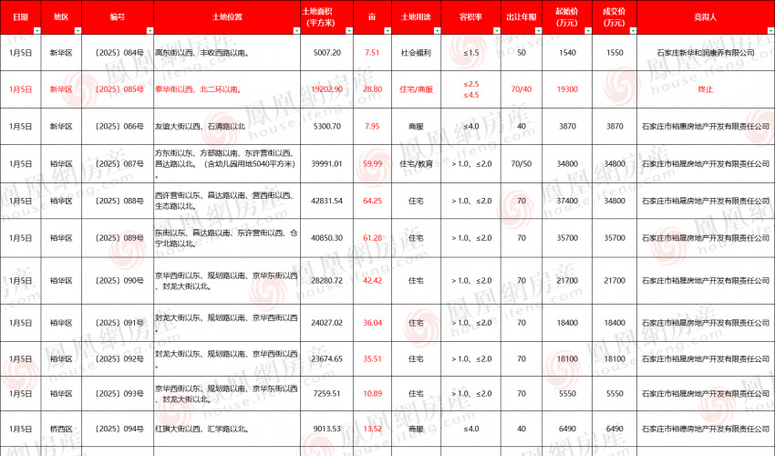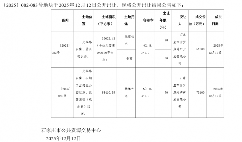 凤凰网房产土拍快讯,于2025年12月12日〔2025〕082-083号地块公开出让,两宗地块位于石钢板块,均由石家庄市开贤房地产开发有限公司底价摘得,该公司为石家庄交投全资子公司