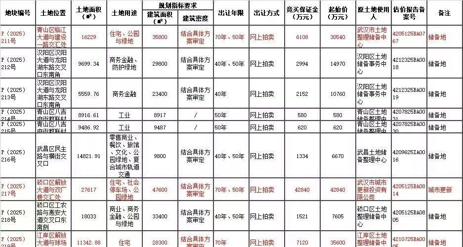 2025年12月18日,武汉13宗地成交,成交金额39.7亿元。原公告中P(2025)204号地块予以终止出让。复星再次拿地硚口,大华继续深耕青山