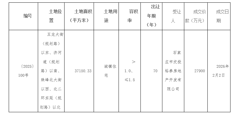 凤凰网房产获悉,〔2025〕100号地块于2026年2月2日公开出让,现将公开出让结果公告如下:〔2025〕100号,位于五龙大街(规划路)以东、济河道(规划路)以南、珠峰北大街以西、北二环东延(规划路)以北,面积37150