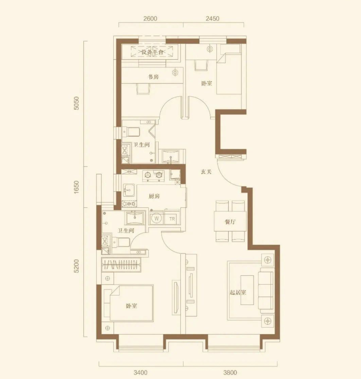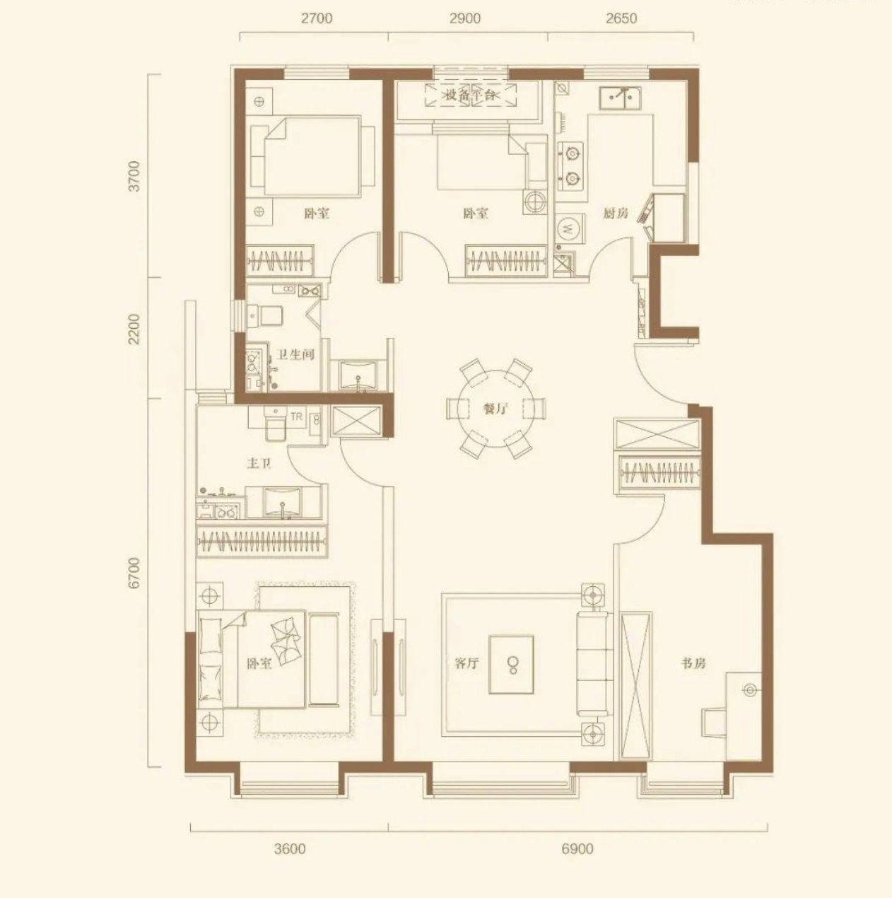 89㎡的3居2卫,这个户型最大的亮点,南北通透,明厨双明卫。南侧为客厅和主卧,均赠送飘窗,北侧书房赠送设备平台,保证了得房率。客厅面宽3.8米,客厅和餐厅连通,显得室内空间并不局促。