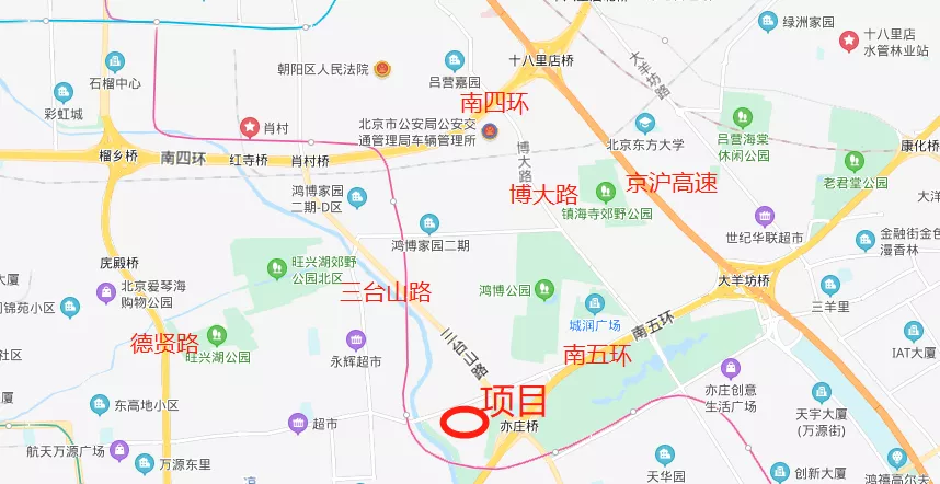 再看看公路,南四环、南五环、京沪高速、德贤路,这四条主路围合。四环和五环之间还有三台山路和博大路,挺方便。