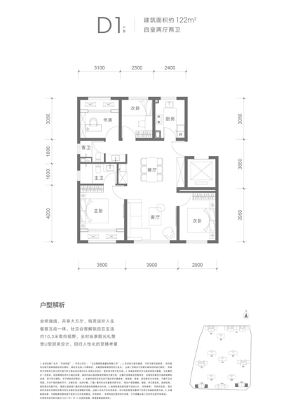 D1户型是122平米四居户型,南北通透,全明格局。U性厨房,餐客厨一体化设计,南向总面宽10.3米,视野宽阔。缺憾是北向次卧略小,做儿童房比较合适。