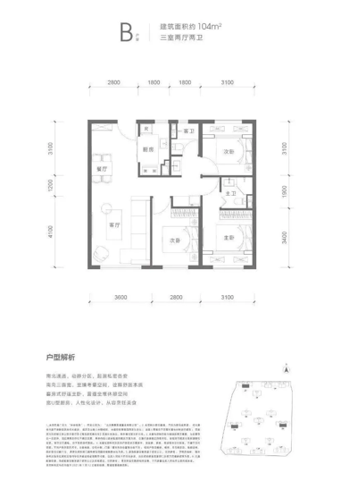 B户型104平米三居:基本可以看为是A户型的PLUS版,整体尺度更宽敞,相对A户型,此户型将会更加舒适一些,另外,A和B户型是两梯四户,是带连廊的,大家一定注意!