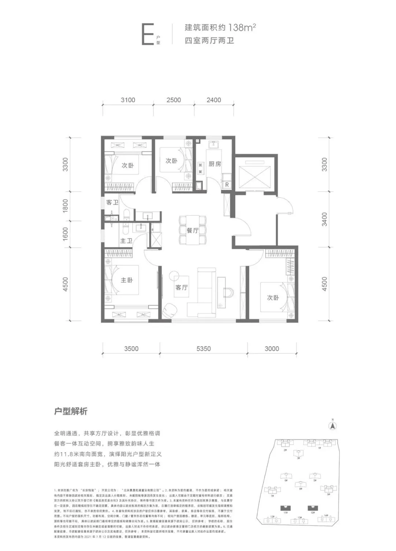 E户型是138平米四居,这个户型已经是两梯两户,赠送了私属电梯厅,全明通透,南向面宽高达11.8米,客厅面宽5.35米,宽厅的采光效果更好,舒适度更高。