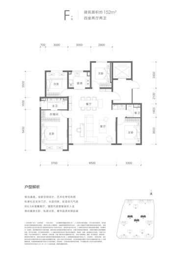 F户型是152平米四居,南北通透,南向双套房设计,私享玄关门厅。最大的亮点是客厅面宽高达6.5米,超宽横厅,尺度奢侈。缺憾是厨房略小,如果再增加一个西厨就更好了。这也是我最喜欢的一个户型,从楼栋的位置来看,也是小区的中心位置,适合追求品质的改善购房者。