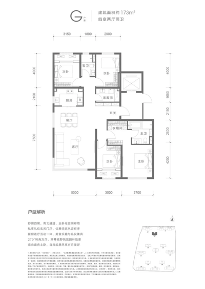 G户型173平米四室两厅两卫:此户型为长安悦玺的楼王户型,南北通透四居;餐厨连体;270转角方厅,主打视野无敌,观景(小区)最佳位置。