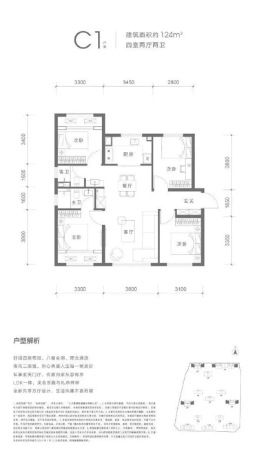 C1户型124平米四居:三面宽朝阳,两个卧室分居客厅两侧,南向面宽10.2米;8窗全明,边户主客卫生间都是明卫,餐客厨一体化设计,通风和采光效果极佳;此项目主力户型,总体上非常的不错!建议有需要的直接盘这个户型!