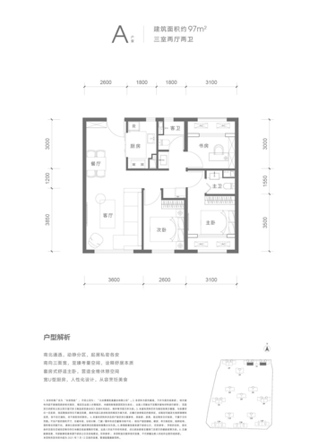 A户型97平米三居:项目最小户型,南北通透,户型方正,空间利用基本无浪费。客厅和两个卧室朝南,南向面宽9.3米,主卧独卫设计,动静分离。美中不足的就是主卧里的卫生间是暗卫。