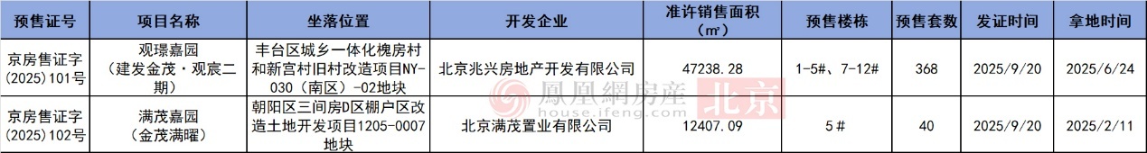 9月15日至9月21日,北京2盘取得预售证,分别为建发金茂·观宸二期、金茂满曜,涉及408套房源,准许销售总面积约59645.37㎡。