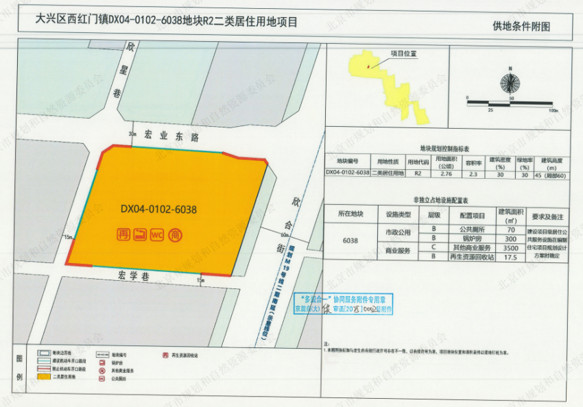 挂牌文件显示,该地块编号为京土储挂(兴)[2025]035号,位于大兴区西红门镇,土地规模27592.846平方米,规划建筑规模63463.546平方米,起始价19.04亿元,容积率2.3,建筑高度为45米(局部60米),土地开发程度为六通一平,建筑密度不高于30%,绿地率不低于30%。
