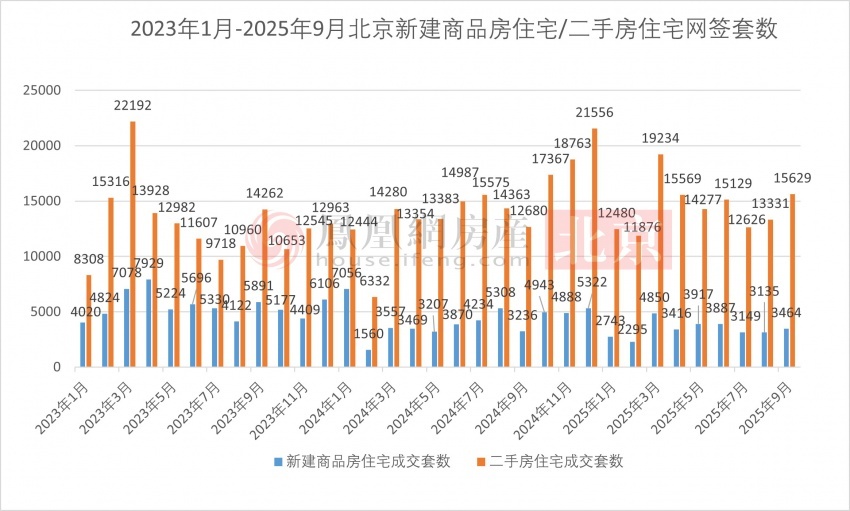 2023年1月-2025年9月北京新建商品房住宅/二手房住宅网签套数