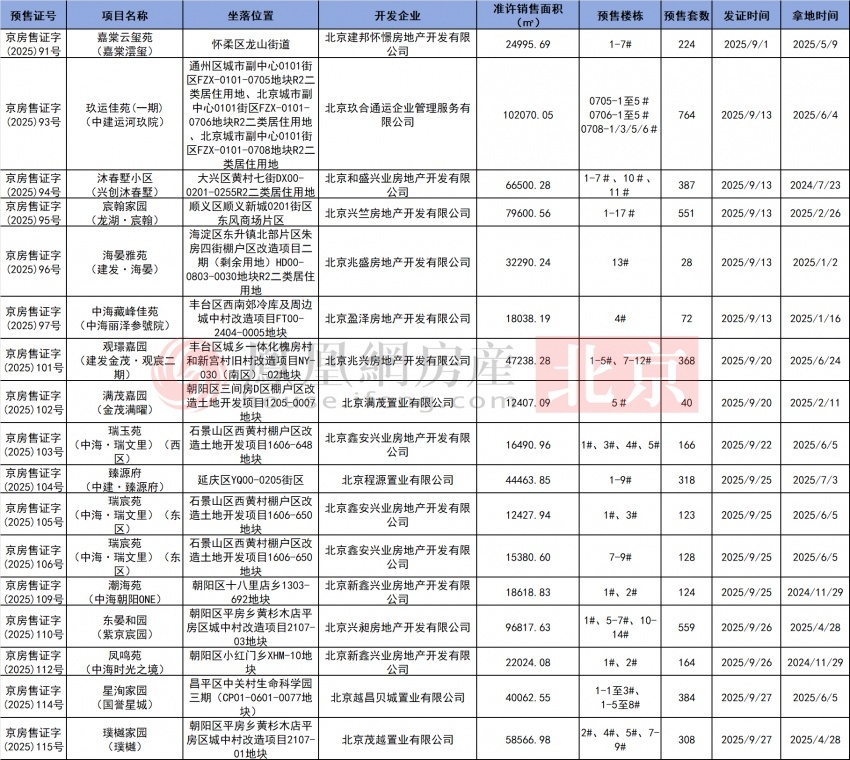 此外,凤凰网房产还注意到,9月份北京获取预售证的数量也是今年以来最高月。具体来看,9月北京共有17张预售证获批,涉及15个住宅项目4708套房源,包括:嘉棠澐玺、中建运河玖院、兴创沐春墅、龙湖·宸翰、建发·海晏、中海丽泽参號院、建发金茂·观宸二期、金茂满曜、中海·瑞文里、中建·臻源府、中海朝阳ONE、紫京宸园、中海时光之境、国誉星城、璞樾。