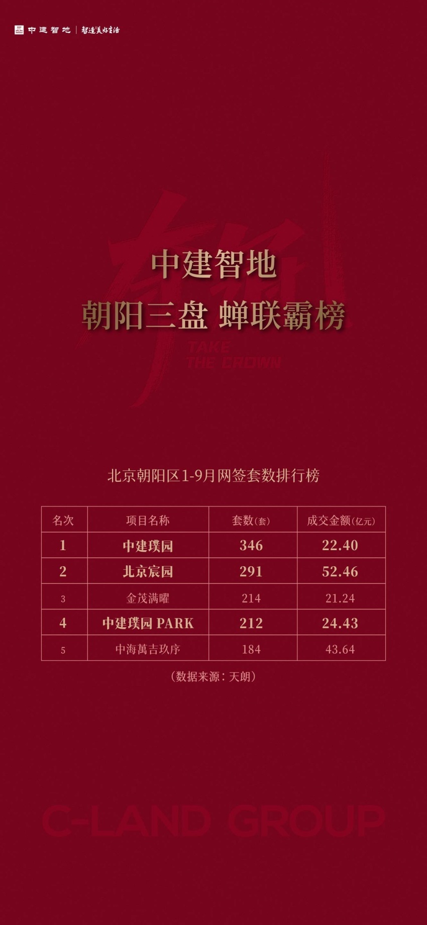 中建智地深耕朝阳,布局中建宸园、中建璞园、北京宸园、璞园PARK、紫京宸园5部人居作品,并于9月30日摘取备受瞩目的太阳宫地块,持续精耕,再掀热潮,夯实其“朝阳霸榜王”的市场地位与影响力。