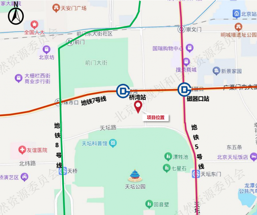 该地块位于二环内,天坛公园正北侧,祈年大街西侧,附近有地铁7号线的桥湾站和磁器口站。