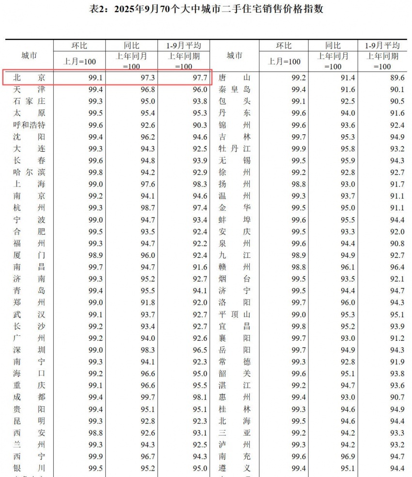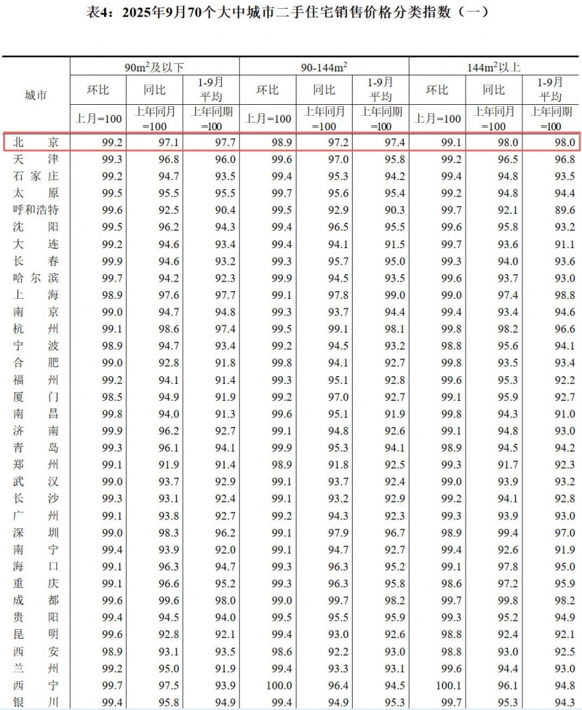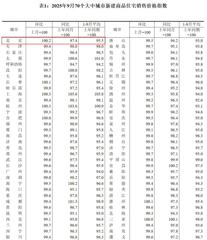 凤凰网房产北京讯 10月20日消息,国家统计局公布《2025年9月份70个大中城市商品住宅销售价格变动情况》。具体来看,9月北京新建商品住宅价格环比上涨0.2%,同比下降2.6%;二手房住宅价格环比下降0.9%,同比下降2.7%,降幅均有所收窄。