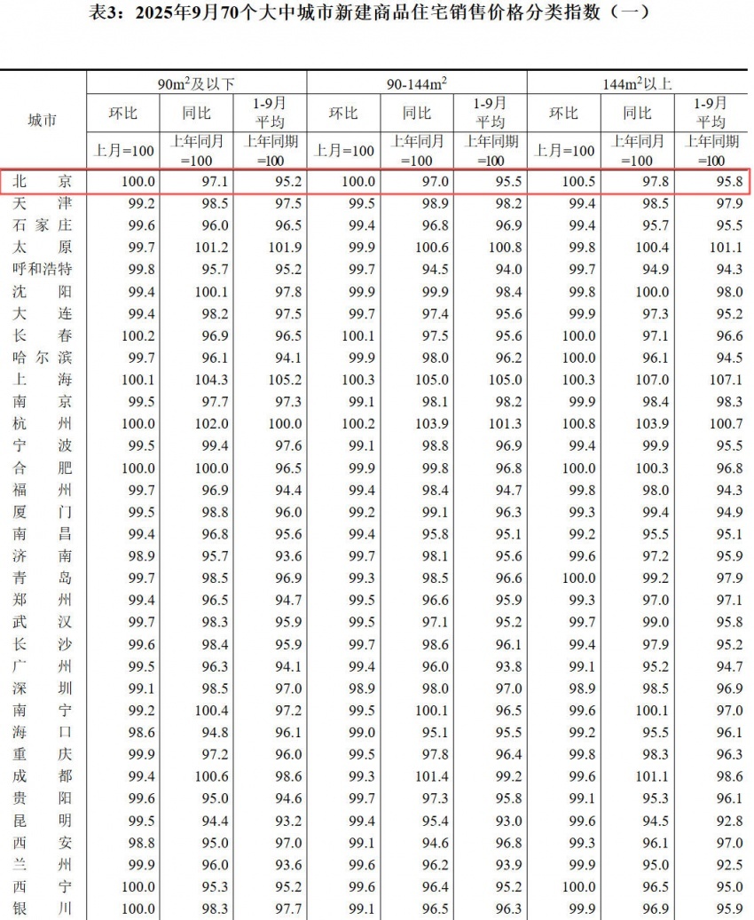 表3:2025年9月70个大中城市新建商品住宅销售价格分类指数