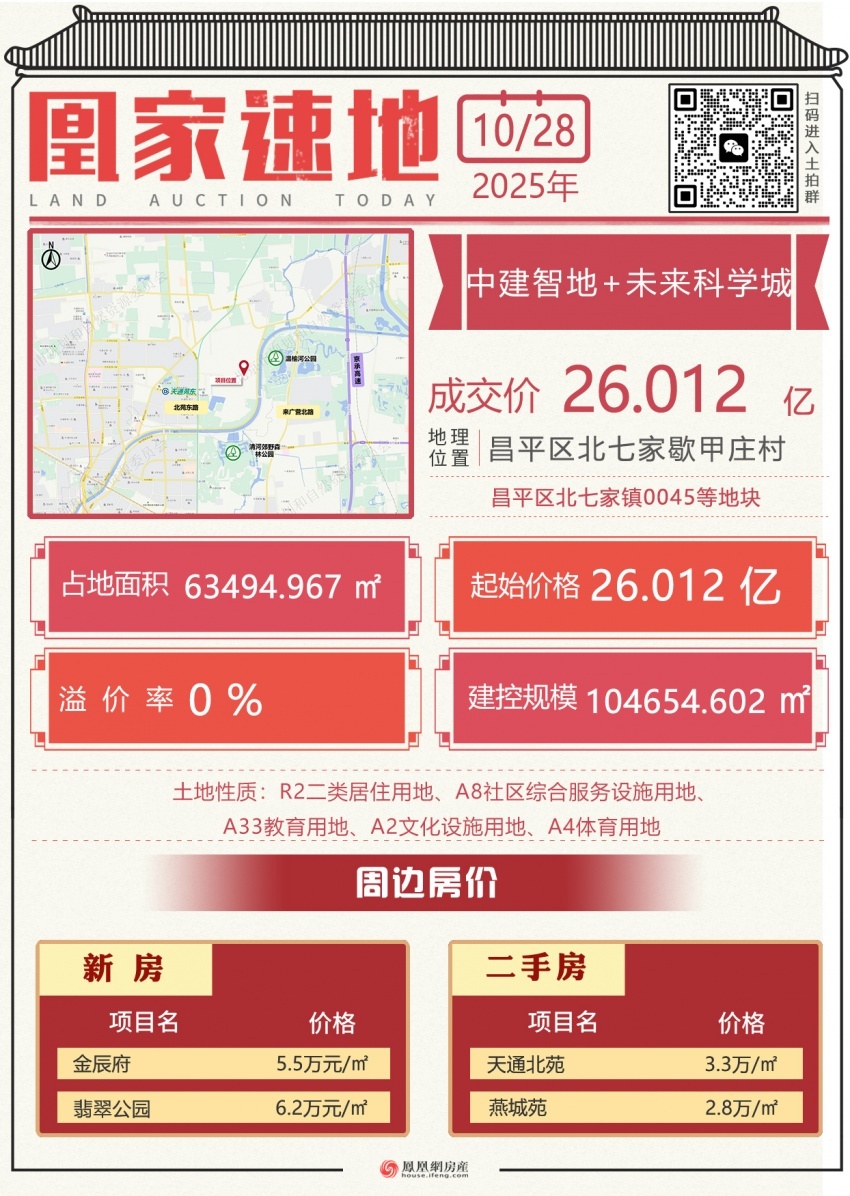 具体来看,该地块编号为京土储挂(昌)[2025]032号,位于昌平区北七家歇甲庄村,土地规模63494.97平方米,规划建筑规模104654.6平方米,住宅容积率2.03、2.1,控高60米,起始价26.012亿元。