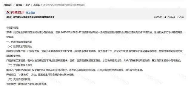 在问政四川官网也有多名业主留言,其中一名四川遂宁高新区湖光九里的小区业主留言称,2025年6月26日~27日收房时发现墙体空鼓严重,室内多处墙面存在大面积空鼓,并涉及承重墙体等一系列房屋质量问题。