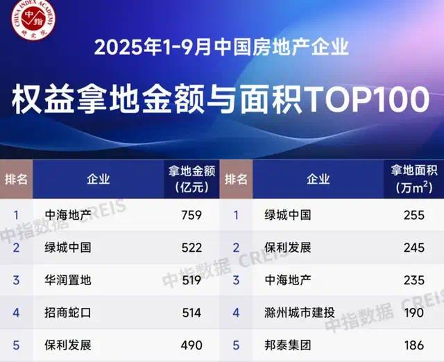 中指研究院数据显示,2025年1月~9月,邦泰集团拿地21宗,拿地面积为186万平方米,排名全国第5;拿地金额87亿元,排名全国第15名,在民营房企中仅次于滨江集团;拿地面积排名第5,位居民营房企第1名,成为今年民营房企中的“拿地之王”。