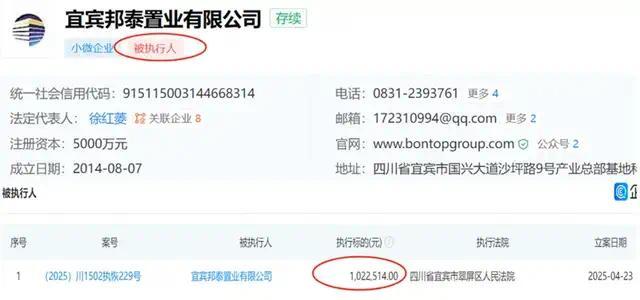2025年4月23日,宜宾邦泰置业有限公司成为被执行人,执行法院同样为宜宾市翠屏区人民法院,涉案金额102万元。
