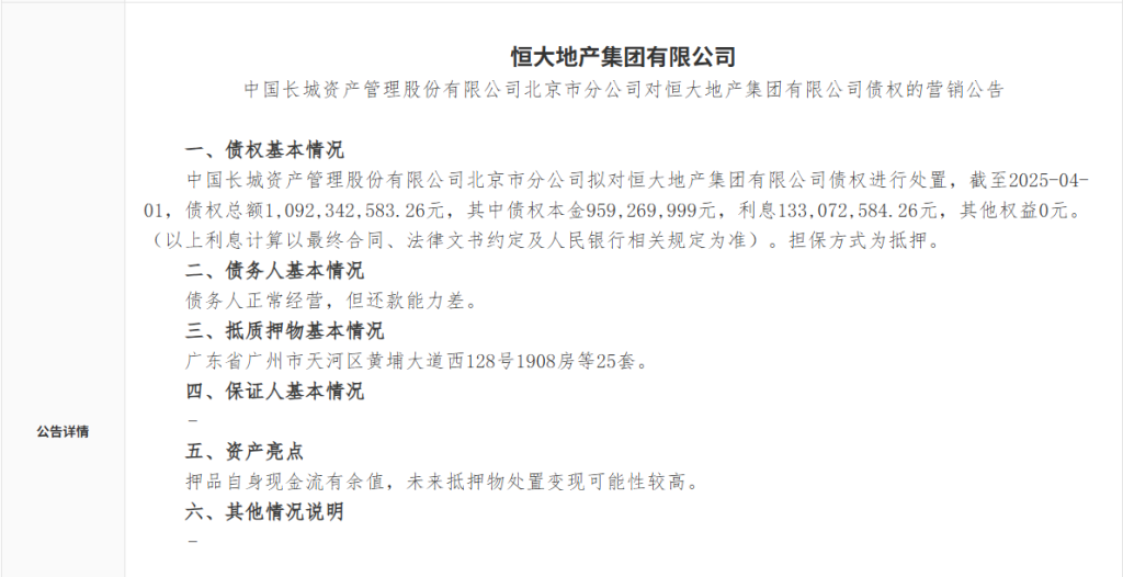 11月19日,中国长城资产管理股份有限公司北京市分公司发布对恒大地产集团有限公司债权的营销公告。