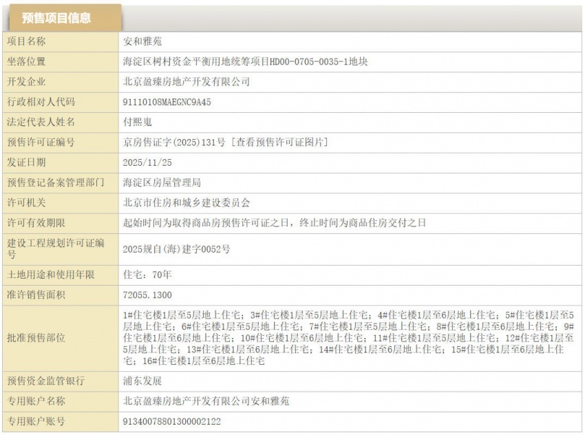 凤凰网房产北京讯 11月26日,凤凰网房产从北京市住建委官网信息获悉,中海树村项目获取预售证,备案名为安和雅苑。值得注意的是,该项目的官方推广案名尚未公布,此前网传为中海圆明玖序。