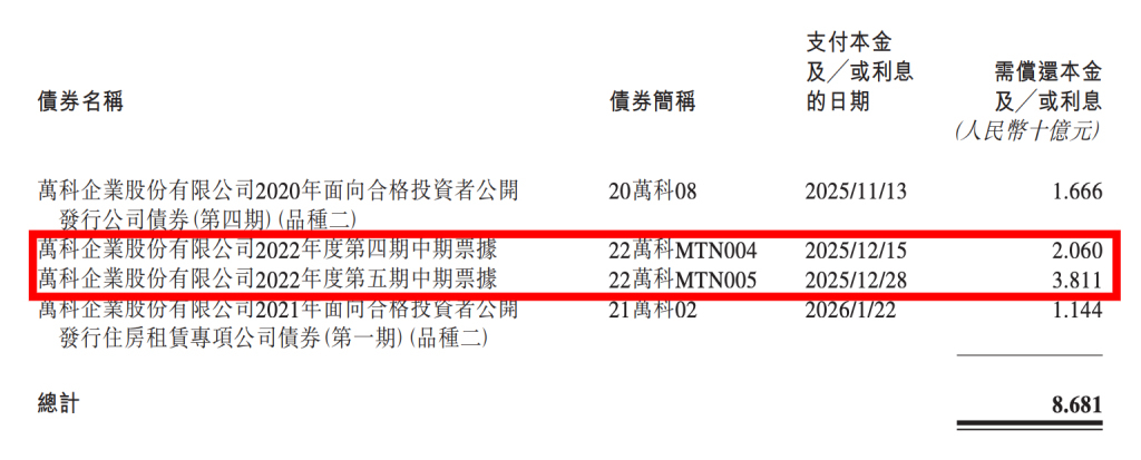 截至今年三季度末,万科已完成288.9亿元公开债务的偿还,且2027年之前已无境外公开债到期。不过,对万科而言,其年内仍有两笔境内债券将到期兑付,除了上述提及的22万科MTN004,还有一笔到期日为12月28日的22万科MTN005,两笔债券余额57亿元,需偿还本金及利息约58.71亿元。