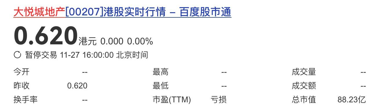 上市12年后,11月27日下午4时,大悦城地产(00207.HK,股价0.62港元,市值88.23亿港元)正式挥别港交所。