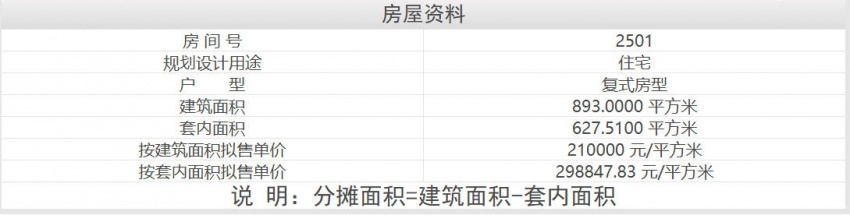 其中,3号楼中的2501号房间,建筑面积达893㎡,拟售价格达到21万/㎡。