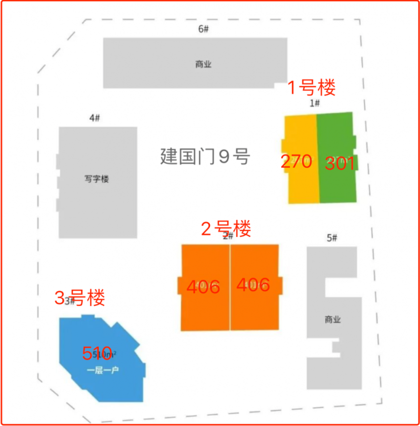 据悉,建国门9号共6栋楼,包括3栋住宅、2栋低层商业以及1栋办公组成。其中1、2、3号楼为住宅,总高16层&26层,共94套房源,标准层户型为267㎡三居,297/401㎡四居,510㎡五居;5套跃层,建面约410-900㎡。