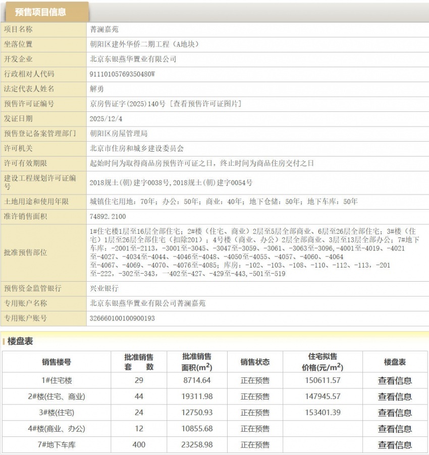 具体来看,该项目位于朝阳区建外华侨二期工程(A地块),开发企业为北京东银燕华置业有限公司,批准预售房源涉及住宅、商业、办公以及地下车库,共涉及93套房源。