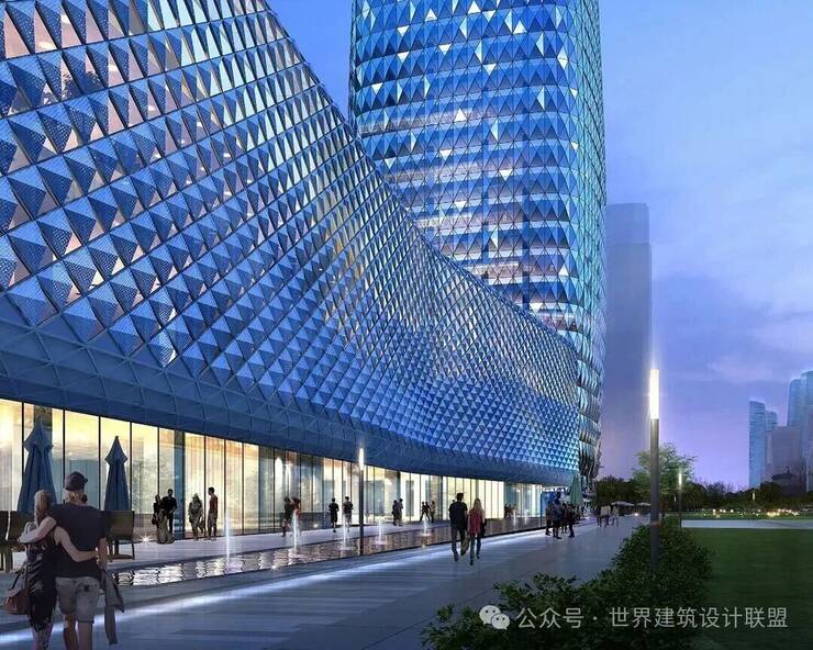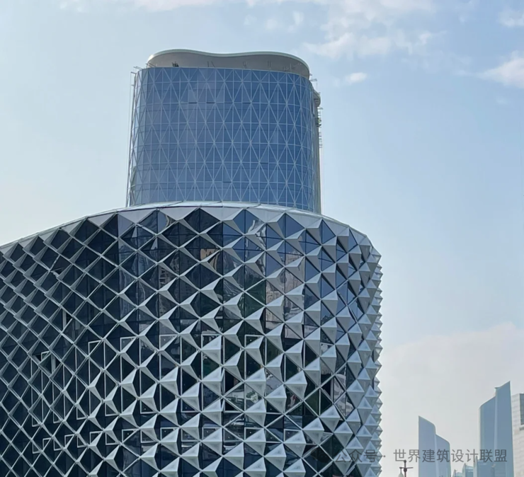 建筑裙楼的“蒙皮系统”通过几何模块与彩色玻璃的搭配,让建筑在不同光线下焕发动态的视觉效果。这一系统由四个单元组成,其阴影几何形状和玻璃颜色在整个立面中变化,赋予建筑有机美感。