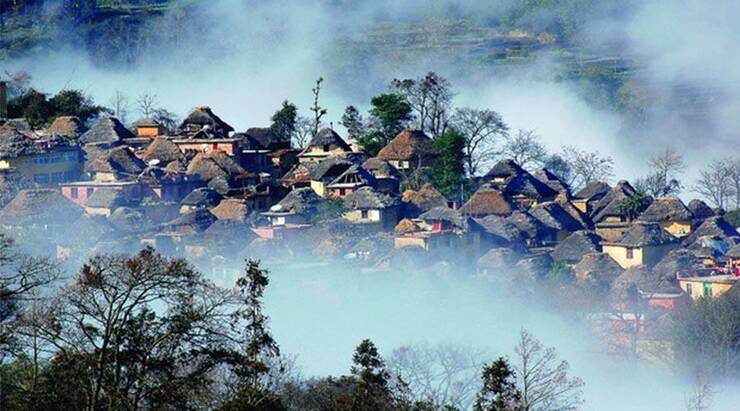 后来他们迁到一个名叫“惹罗普楚”的地方,看到漫山遍野生长着大朵蘑菇,不怕风吹雨打,还能让蚂蚁和小虫子在下面做窝,他们就仿照蘑菇的样子盖起了蘑菇房。