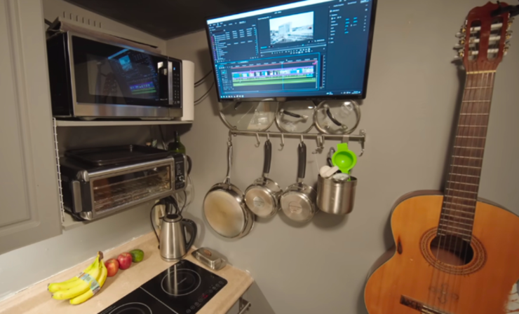 吊柜和底柜负责收纳,吊柜不仅有柜门板,还有一个两层的开放式柜格,用来放烤箱和微波炉;底柜则收纳碗碟餐具和日常厨房所需的各类瓶瓶罐罐,让小厨房看起来更显整洁干净。厨房位置还挂了一台小小的显示器,既可以在做饭做菜时看视频,又可以当成家里放音乐、电影的显示屏;屏幕下方直接挂锅碗瓢盆,用到的时候随手拿取也十分便利。