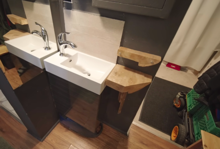 洗手台很小,做成了侧向台盆,上半部分甚至还安装了一组镜柜,用来放他日常所需的清洁洗漱用品,明面上干干净净,没有丝毫杂物。 而台盆旁边的支架,则是床脚的支架,虽说都是自己做的,看起来有些粗糙,但却能保证稳固。