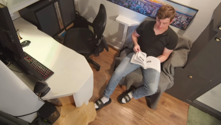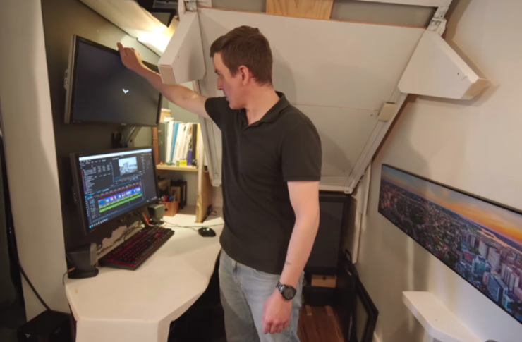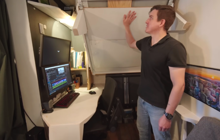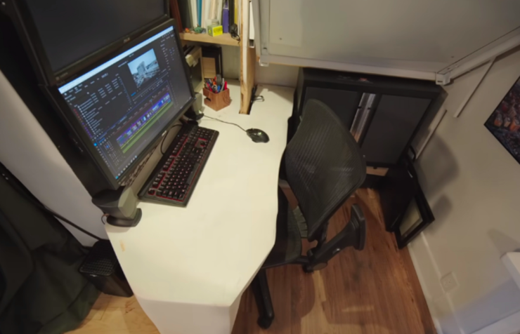 若说家里哪些地方他最常待,当属这电脑桌的位置,本身就是摄影师的阿德里安,平时会在这里工作、剪视频,或者是玩游戏,可以说下班回家后直到睡觉,大半时间都是坐在这书桌前度过的。 桌面并非方方正正,而是硬核空间走势,做成了带弧线又不齐平的异形书桌,虽说看起来有些许别扭,但实际上却能最大限度上保证桌面尺寸,况且这桌板和桌架还是他自己切割而成,进一步降低了装修成本。