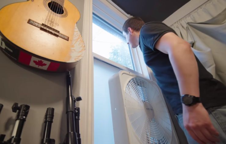 窗户下半部分贴了磨砂贴纸,尽可能在不影响采光的前提下遮挡视线。他增加室内通风的方法也很简单——直接在窗台上摆一台换气扇,开窗后再打开换气扇,就能让新鲜空气快速充满这个10㎡的蜗居。