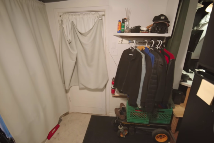 有趣的是,这挂衣架是阿德里安自己DIY而成的,可以平移开,在后面增加挂钩,挂置雨伞、隐藏电源和网线,以及灭火器,外面挂上一件件的外套后,反而看起来更加整洁,隐藏起了这些较为琐碎的杂物。