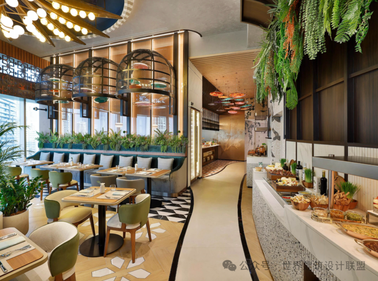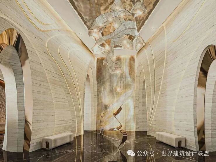 墙面装饰融入迪拜的沙漠肌理与海洋元素,如用砂岩材质复刻沙丘纹路,用蓝色玻璃拼接出阿拉伯湾的波浪形态,让在地文化自然融入空间。