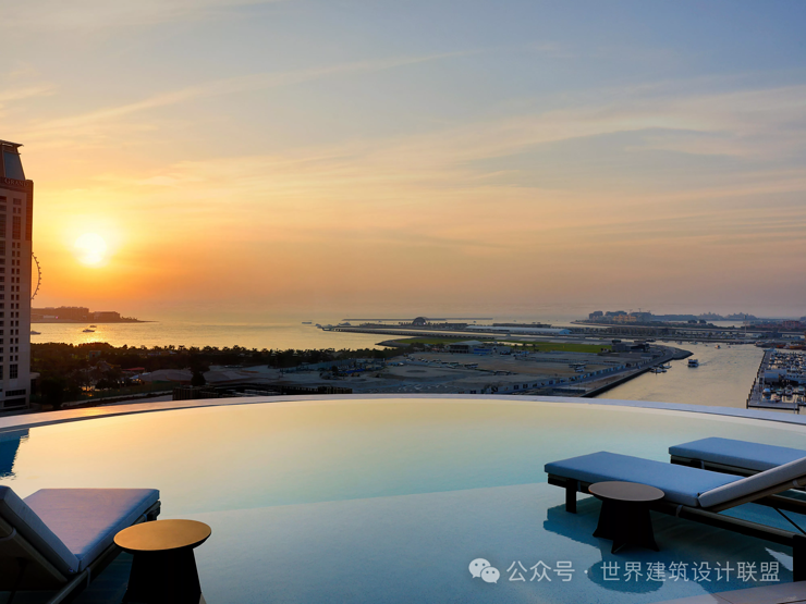 酒店顶部设有天际无边泳池、餐厅及酒吧,可俯瞰棕榈岛全景。76层的TATTU Sky Pool更以294米的高度成为新一代“全球最高酒店无边泳池”。