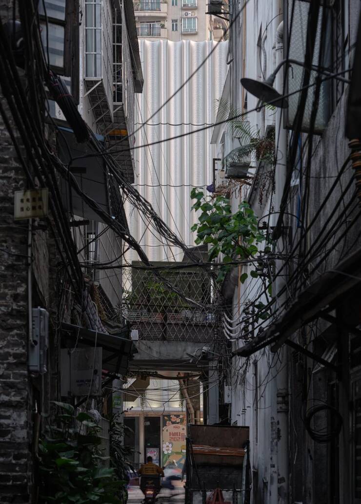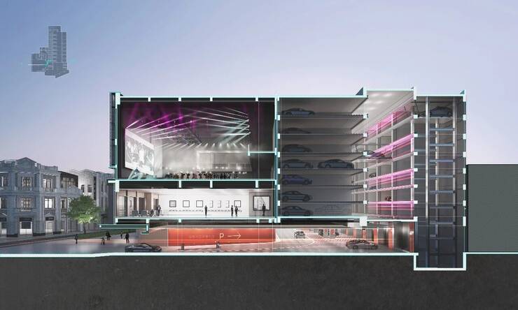 停车问题是老城区城市更新中的一大难题,作为每年几百万人次的“城市网红点”,停车是不可回避的难题,而永庆坊最后的希望就在只剩下一片墙的“金声电影院”。都设采用立体机械式无人车库,在小小的几千平米内设置了300-400辆车的停车,基本解决了永庆坊的停车问题。同时用一个多功能演艺场所回应了历史上的演出功能。