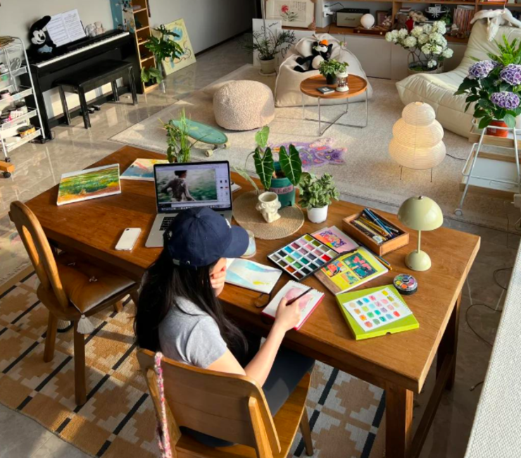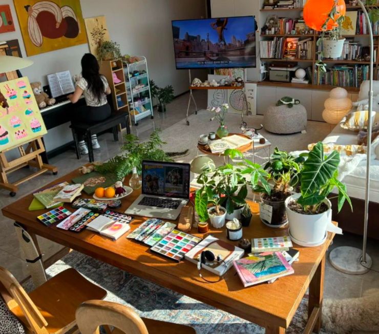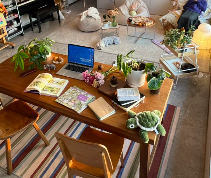 改造后的客厅,主要分成了两个功能区: ①一个是阅读区,放了个懒人沙发,累了就窝在里面看书、看电影,整个人都能陷进去,舒服到不想起来。 ②另一个就是办公区,选了靠近窗户的位置,摆了一张超大的办公桌,笔记本、手机、咖啡杯、书籍、多肉、仙人掌,甚至颜料、画板,全都能一次性摆上去,一点都不拥挤。