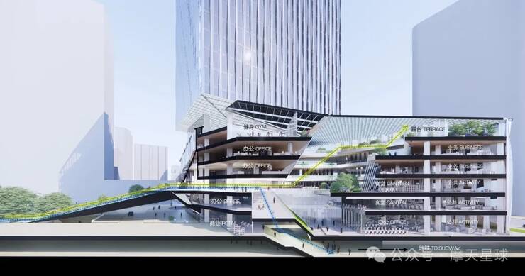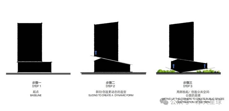 建筑遵循金融城整体风貌管控,裙楼高度控制在40米以下,主体塔楼通过灵活的高度调整策略,既和谐融入城市天际线,又凸显了自身标志性。